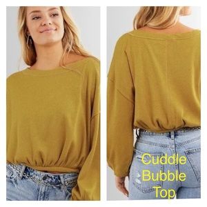 Free People We The Free Cuddle Bubble Top measures 24 1/2” from underarm to underarm and 20” from shoulder to hem. It is a polyester, viscose and nylon blend. Size Medium EUC