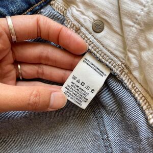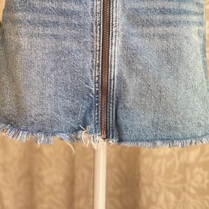 Description: medium wash zip front raw hem denim mini skirt by We The Free for Free People in US women’s waist size 24. There is very little stretch to this material