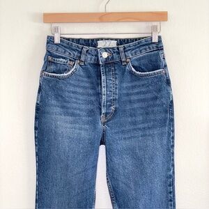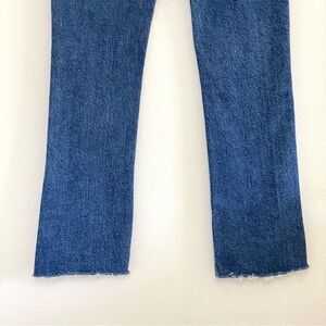 Free People We The Free Emmy Split Hem High Waist Boot Cut Jeans in Medium Blue, Size 27. May also fit 26, see measurements.