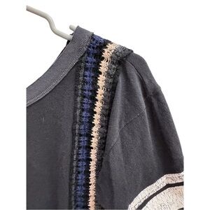 Product Features Scoop neckline Graphic at front; crochet trim at sides; unfinished edges Distressed stripes at sleeves Body and crochet contrast: 100% cotton Imported