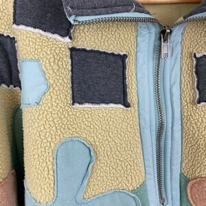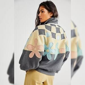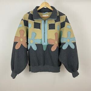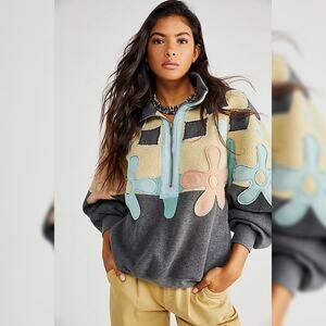 Just as essential as it is effortless, this vintage-inspired pullover is featured in a quarter-zip, slouchy silhouette with faux-fur piecing at top and floral patching throughout for added dimension.