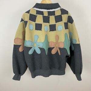 Oversized fit (maybe by about a size/size and a half.) Features a kangaroo pocket, ribbed hem and sleeve ends, and a collared neckline with a half zip closure. Big floral detail and check design.