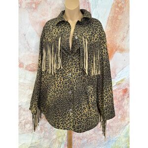 Features: Vegan suede fabrication, button-front closure, collared neckline, long button-cuff sleeves, fringe along chest, back, and sleeves, curved hem with side slits, animal print