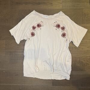 This We The Free tee features a relaxed, oversized fit, cotton jersey fabrication, and a scoop neckline. It also has drop-shoulder short sleeves, raw trim, exposed seams, embroidered florals, and studded accents.