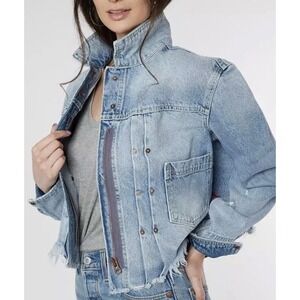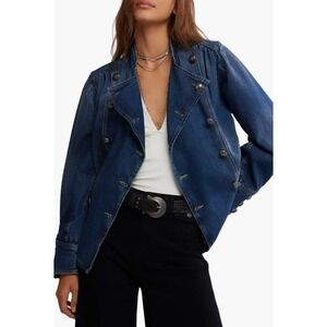 Free People We The Free Iggy Hooded Denim Jean Jacket Large Blue Knit Sleeves