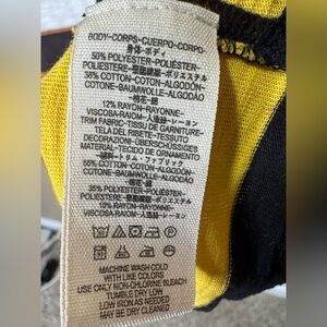 This layered top features ribbed long sleeves under an oversized tee for an effortless look that's ready for the weekend. V-neckline, side slits, comfy relaxed fit. Lightweight jersey fabric with black, orange, yellow, ivory and green stripes. Polyester, cotton and rayon blend.