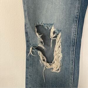 In good preowned condition other than an incredibly faint spot of discoloration on the front (super hard to capture). Button fly. Distressed.