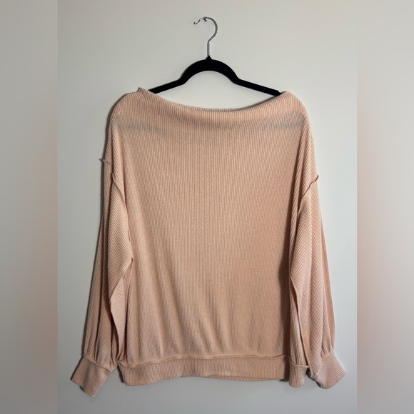 Keywords: Free People sweater, We The Free, boho chic, oversized top, off-the-shoulder sweater, cozy knit, lounge wear, peach sweater, slouchy fit, minimalist style, soft knit pullover, fall fashion