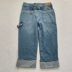 Features: Zip fly and button closure, oversized patch pockets, exaggerated cuffed hemlines, utility details throughout