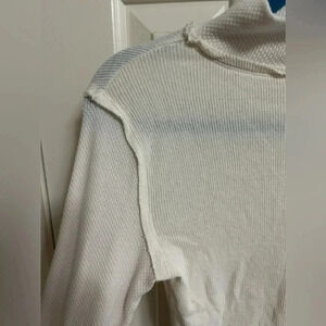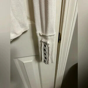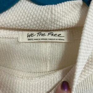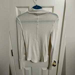 This is a Free People We The Free blouse in size small. It features a mock neck and long sleeves with mixed textures. The top is an off-white color and has really cute button accents on the sleeves. It is pre-owned, but is in excellent condition!