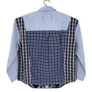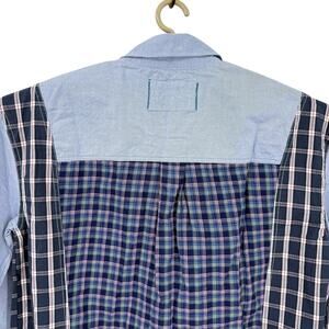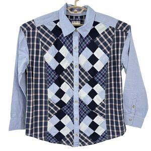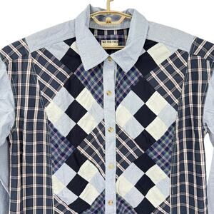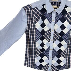Amazing 100% cotton denim patchwork button-down shirt. Plaid panels with patchwork quilt diamonds down the front and a plaid flannel down the back. Boyfriend, oxford shirt, oversized. Size large it is new with tags. Laid flat it measures approximately 25 inches armpit to armpit and the length from the top of the shoulder down the back 28 inches.
