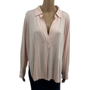 No matter what you pair with the Can't Fool Me Tee in peach from Free People, it makes every outfit more effortlessly easygoing. The super soft oversized tee feels like your comfiest pajamas but looks appropriate for daytime. This long sleeve tee offers a superbly soft fabrication for easy all day wear. Oversized silhouette and spread v-neckline collar and long sleeves with slit cuffs. High low hemline with exaggerated split down the front. Vented at side hems. Soft peach color, pinkish orange. Rayon / spandex. Hand wash. OB738608. In preowned condition, has two marks on the collar, may come out when cleaned.