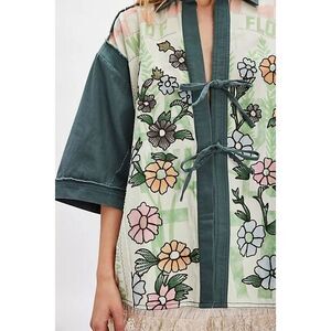 Utility meets whimsy with this boxy kimono-style layer from We The Free, featured in a crisp cotton poplin with tie-front details and playful prints bodice, finished with chain-stitched florals for a fun touch.