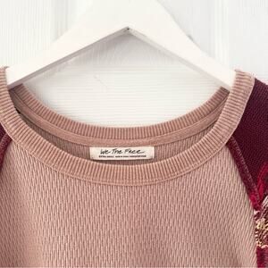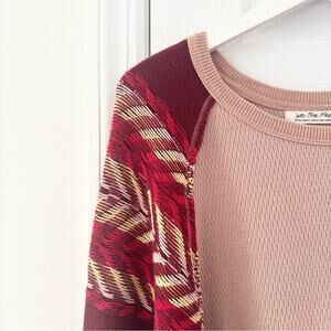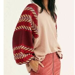 Size XS from Free People X We the Free. Style name Rainbow Dreams. Blush pink waffle knit blousy top with red and pink chevron aztec design woven balloon sleeves. Preowned. Some pulls as shown in photos. No other stains or tears.