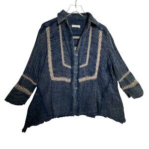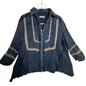 Features: Classic collar, button-front closure, raw hemlines, dropped shoulders, lower side hems