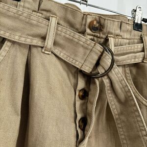Features: Mid-weight, non-stretch denim Pleated paper bag waist with attached D-ring belt Frayed hem Button fly 5-pocket styling Shell: 100% cotton.