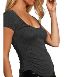 Stay effortlessly stylish with this Free People We The Free scoop neck t-shirt in a versatile gray shade, size L. Crafted from a soft and stretchy fabric, this tee offers a flattering fit with subtle side ruching for added shape. The scoop neckline and short sleeves make it a perfect staple piece for layering or wearing on its own. Whether paired with jeans for a casual day out or dressed up with accessories, this top is a must-have for any wardrobe.