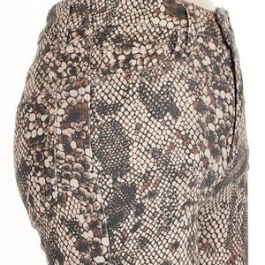 Make a statement with these unique Free People "We The Free" jeans. They feature a bold and trendy all-over snake print in shades of brown, black, and beige. The jeans have a flattering fit and a stylish raw, frayed hemline.