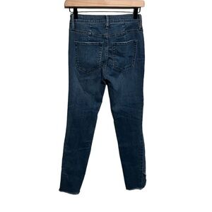 Free People We The Free Sunny Midrise Skinny Jeans. Medium wash blue jeans. Distressed front. Button and zip fly closure. Classic 5-pocket styling. Skinny leg. Q
