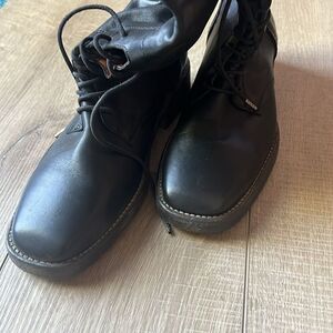 Features: Tall silhouette, pull-on style, leather fabrication, pointed toe, work boot design elements, lace-up closure, slight stacked heel, pull loop detail