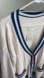 Features: Cable-knit fabrication, V-neckline, striped ribbed trims, button-front closure, front pockets, drop-shoulder sleeves