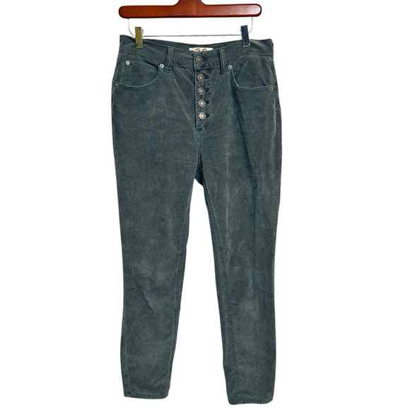These We the Free by Free People pants are designed for women and come in size 28. They are made from a gray/blue corduroy material and are super comfy! The pants have a solid pattern and include a button fly closure with stretch for comfort.