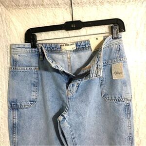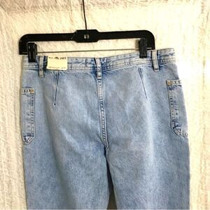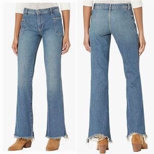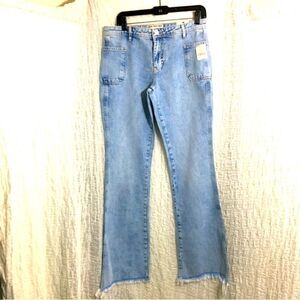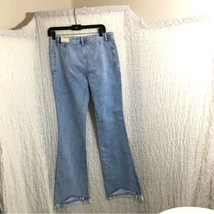 Blue medium wash flare jean with a retro look. Fringed raw distressed hem. It's new with tags. Please refer to pictures for best description and condition verification.