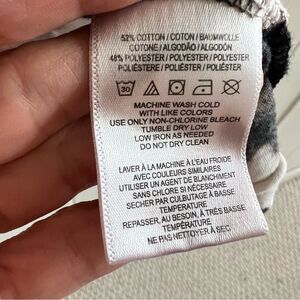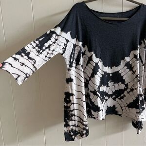 Gray and white tie dye print. • Dolman • Boatneck • 3/4 length sleeves • Curved Shark-bite hem • Super soft material. • 52% cotton, 48% polyester • Machine wash cold, tumble dry low