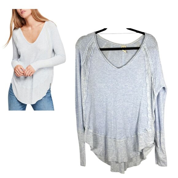 Free People We the Free Catalina Thermal V Neck Blue Oversized Long Sleeve Waffleknit Top Size Small