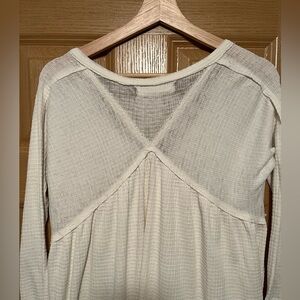 A few blemishes on this shirt as pointed out in last 3 pictures. There are two dots on the arm - i forgot to try to scrub these when I washed this so they could still come out. There is a faint yellow line on the front under the buttons I'm pointing to, and then on the arm, the fabric is just not sewn down like it is on the other side... not ripped or anything - it's just hanging out for some reason!