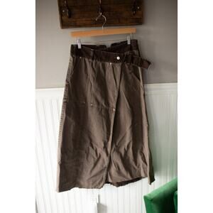 Features: Asymmetrical waistband, side button closure, utility pockets throughout, front slit hem feature, back cinch band for adjustable fit