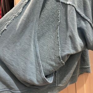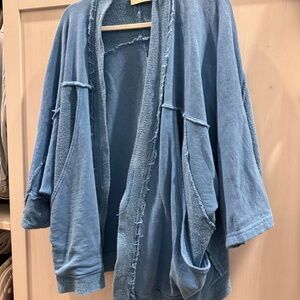 This cardigan is almost like a Kimono. It's very oversized Has 2 deep front pockets. All seams are frayed as that is the style. It's sweatshirt material but not too thick, this is more of a summer staple. Coming from a smoke free home.