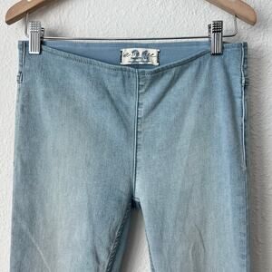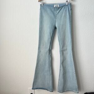 Step out in style with these trendy Free People flare light wash denim jeans! These jeans are in excellent condition and ready for a new home. Featuring a comfortable elastic waist and a unique no-pocket front design, they offer a flattering fit and a modern look.