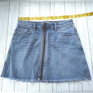 Free People We the Free Zip It Up Denim Distressed Mini Skirt in Med Wash Sz 25