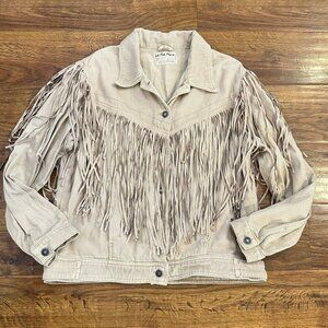 Western-inspired denim jacket featuring exaggerated fringe detail in an oversized, slouchy silhouette. Button front closure Side pockets Yoking throughout Care/Import Dry Clean Only Measurements