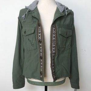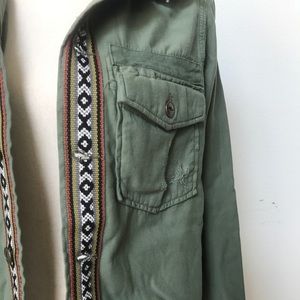 Cotton twill jacket boasts an eye-catching Embroidered trim down center front with distressed pocket design.