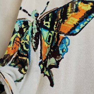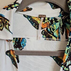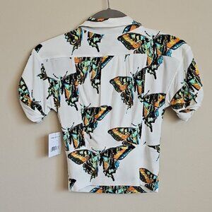 Stylish button-down with vibrant butterfly design. Features a chic tie-front detail. Perfect for casual outings.