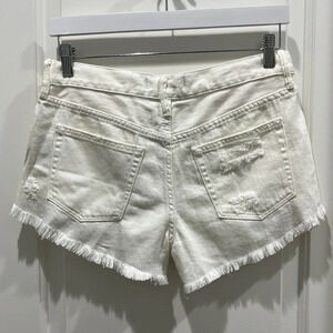 Sturdy denim shapes these trendy shorts with a five-pocket cut, belt loops, and a branded top button, plus a hidden button fly. Distressing throughout and shredded cut-off hems lend a laid-back look to these must-have shorts!