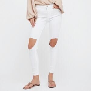Upgrade your wardrobe with these Free People high-rise white skinny jeans in size 30. Featuring trendy distressed knee cutouts and a sleek silhouette, they offer the perfect blend of edgy streetwear and everyday comfort. Crafted from a soft cotton blend with a touch of stretch for all-day wear. Light black markings on the back waistband (see photo), otherwise in excellent pre-owned condition. Perfect for pairing with tanks, crops, or cozy knits.