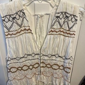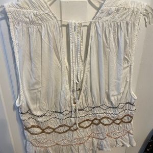 Chic white crop top with intricate embroidery. Features a clasp front and tie-back design. Perfect for casual outings.