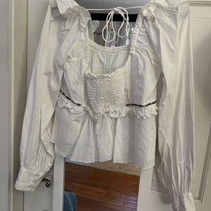 Elegant white blouse with black tie detail. Features long sleeves and ruffled hem. Perfect for casual or dressy occasions.