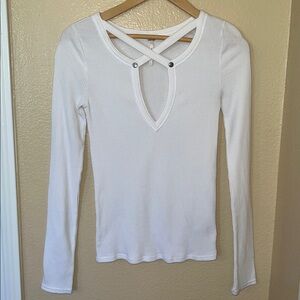 Elegant white blouse with unique neckline. Long sleeves. Perfect for any occasion. Fabrics include 58% Cotton, 39% Polyester, 3% Spandex