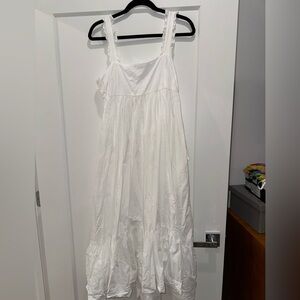 Elegant white maxi dress. Sleeveless with ruffle straps. Flowing silhouette. Perfect for summer.