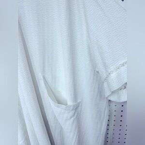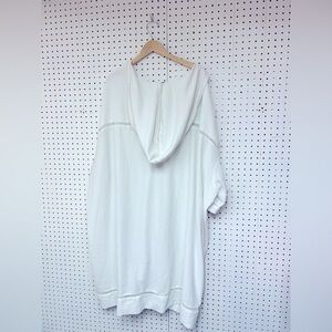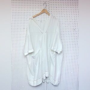 Elegant white hooded kaftan featuring large pockets. Perfect for a relaxed, stylish look.
