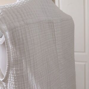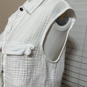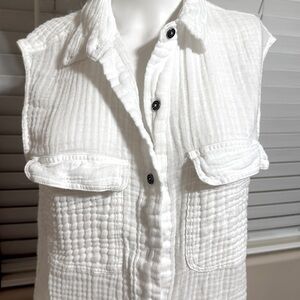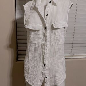 Stylish white sleeveless button-up shirt with front pockets and black buttons. Very light and soft!