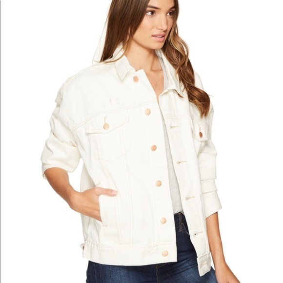 Super cute denim jacket in white with Rose gold details by Free People. New with tags, never worn. Perfect amount of intentional distressing throughout. Size M/L.