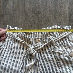 These Free People shorts feature a stylish vertical striped pattern in white and blue, offering a relaxed fit perfect for casual summer days. Designed with a drawstring waist and rolled hems, they provide both comfort and a trendy look. Ideal for beach outings or laid-back gatherings, these lightweight cargo shorts are a must-have for your warm-weather wardrobe.