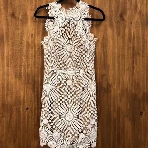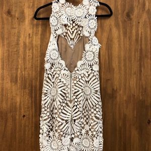 Elegant lace dress with floral patterns. Open back design. Sleeveless and fitted silhouette.