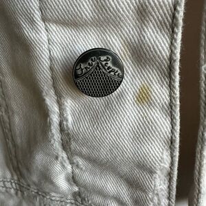 Chic jean jacket with a cozy hood. Features a stylish white and gray design. Ideal for layering. It has 2 stains in the photos, you can see them