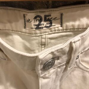 Free People white ripped jean skirt. Front and back pockets. The front of the skirt is shorter, as seen in the measurements. Size 25.